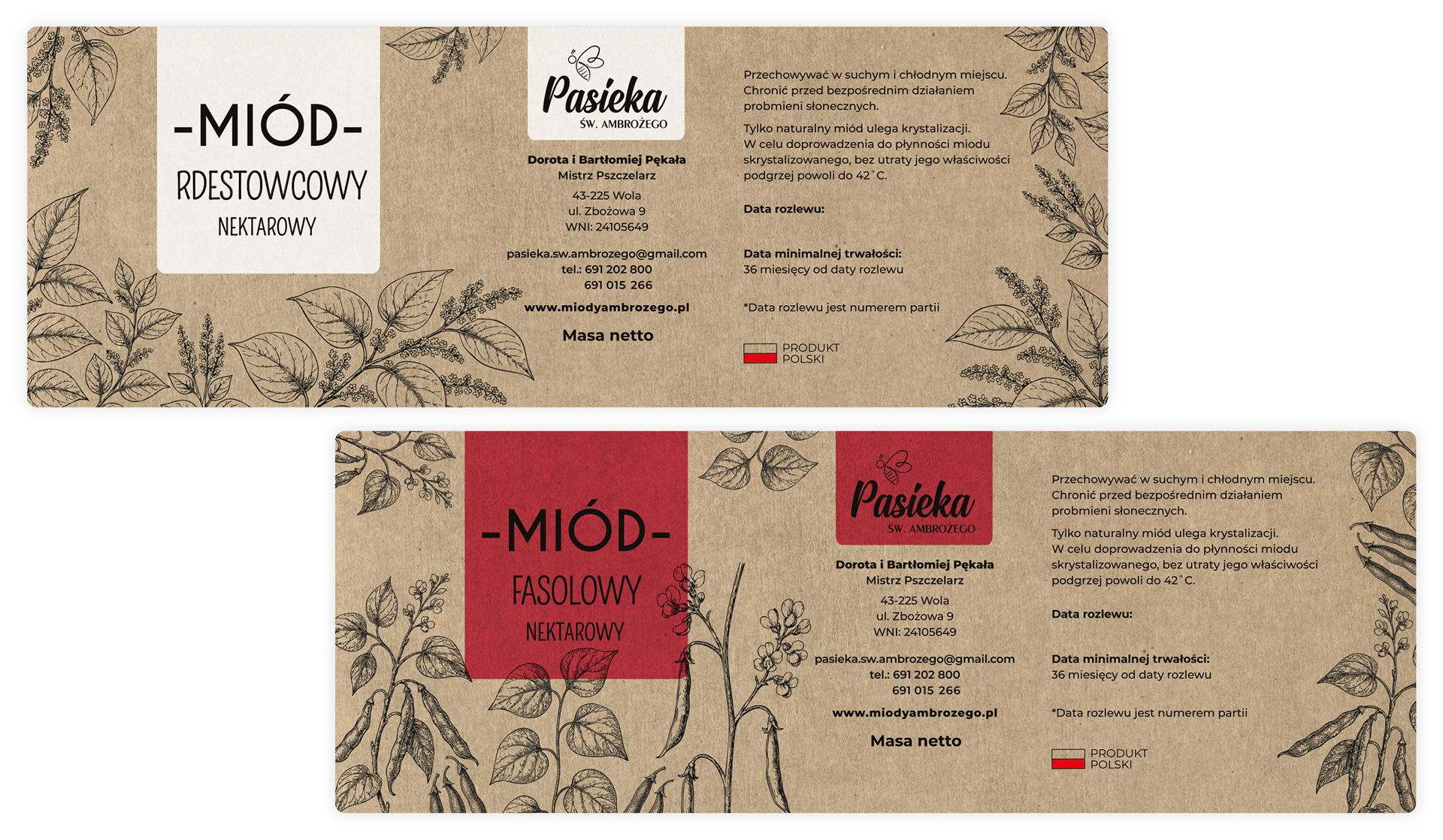 For Pasieka Sw. Ambrozego in Poland, I designed a complete line of flavored honey jar labels that combine strong visual identity with strict compliance to food labeling regulations. Each label in the series is thoughtfully crafted to harmonize with the artisanal character of the brand while differentiating the various honey flavors through distinctive and inviting design elements. The layouts carefully incorporate all mandatory information required by Polish and EU laws, including the net weight in grams, a clear ingredient list, and a designated space for retail-specific codes such as barcodes or lot numbers. I ensured that these essential details are presented in appropriately sized, legible fonts that meet regulatory standards for readability and placement.